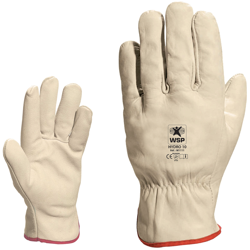 Gant cuir pleine fleur de bovin hydrofuge. Qualité supérieure. Renfort paume, pouce et métacarpe. Coupe américaine.